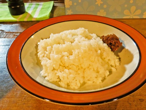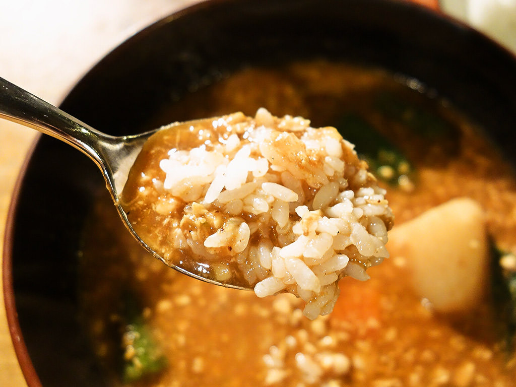 お米は水分ちょい少なめ、粘度中程度、パラパラ感少ないもののスープにしっかり馴染むお米!
